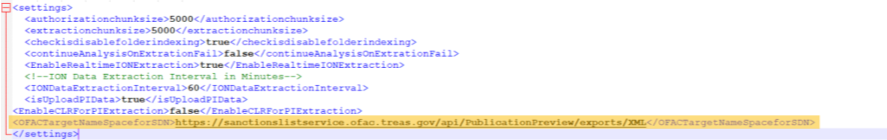 - Update the namespace value in the extractionsettings.xml file as shown below.