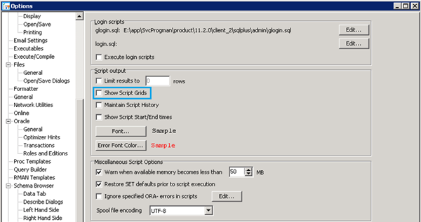Prerequisites For Toad you must have Toad version 12.10.0.30. Turn off Grids in Editor. To do this: Navigate to View > Toad Options. Scroll down to Scripts and clear the Show Script Grids check box. Turn off Grids in Toad Script Runner. To do this: In the Toad Script Runner Navigate to Edit > TSR Options. Click Scripts in the left hand panel of the screen and clear the Show Script Grids check box as shown below.