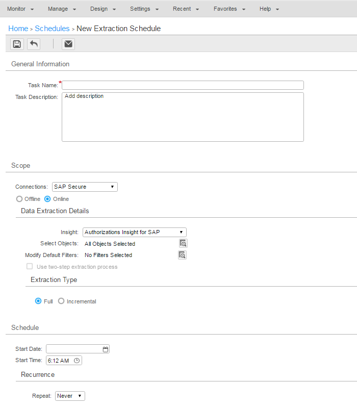 - On the New Extraction Schedule page, specify a name and description for the schedule.