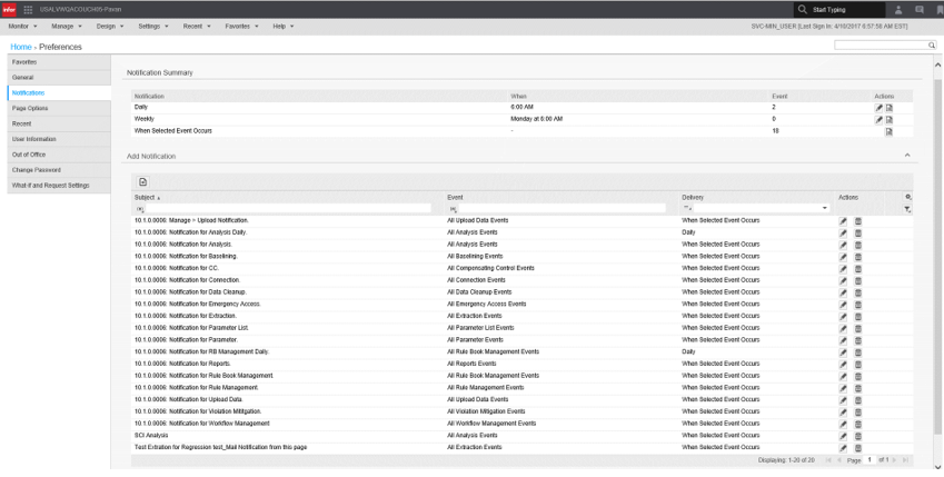You can set notification from a rule when the Rule is modified. You may also send notification, when an Analysis using the Rule produces a Violation. Email notifications may be sent to yourself, other IRC users, and other colleagues who are not IRC users. Additionally, notification can be sent to a group, via a Parameter List.