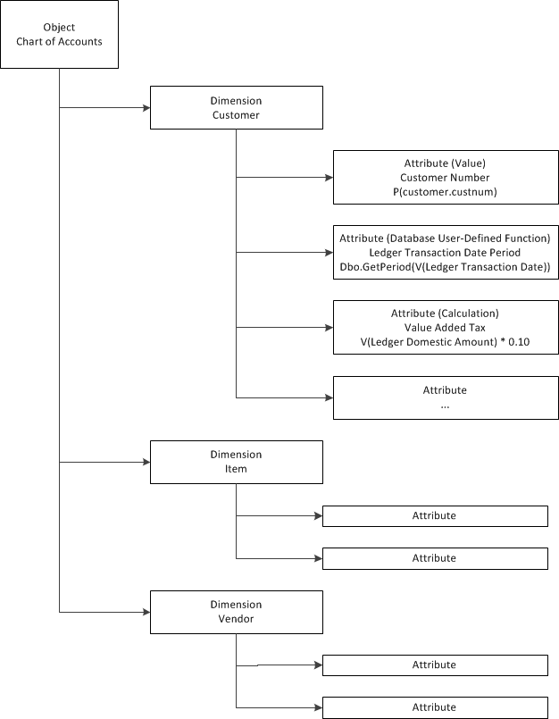 The diagram in this topic provides an example of how the Chart of Accounts object can have multiple dimensions and attributes.