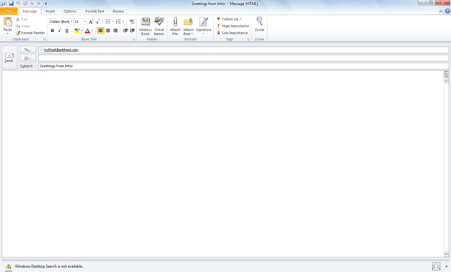 In this case, the stringID becomes Send Email, and clicking this button opens the default email client with myEmail@address.com as the recipient and a subject of Greetings from Infor.
