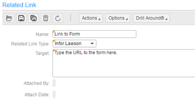 To send a link to an Infor form, select Infor Lawson, Landmark, or M3 as the Related Link. Specify the URL to the form in Target.