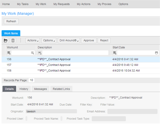 In the example, several Contract Approval work items are in the Inbasket for the task "Manager." There are three ways to access them:
