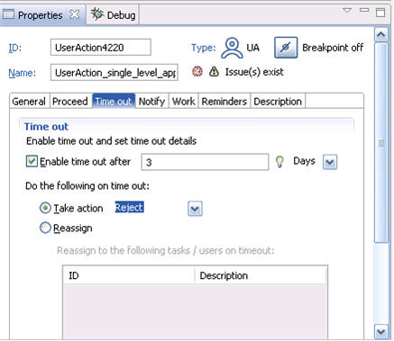 Configuring time out behavior, that is, define how the process goes if no one takes appropriate action within the configured timeframe.