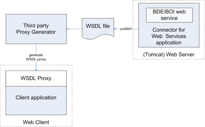 You can use the WSDL file to generate WSDL proxies for the web client. To generate these proxies, you must use a proxy generator provided by a third party web services toolkit vendors, for example, the Proxy Generator of AXIS 1.4, a Java SOAP implementation provided by Jakarta. You first retrieve the WSDL file from the connector, copy the WSDL file to your local system and then import the file in the Proxy Generator.
