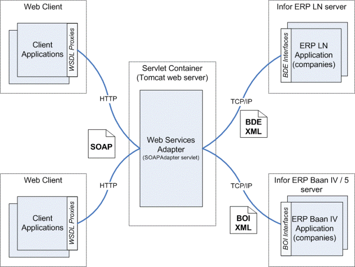 The exchange of SOAP messages between the web client and the web server is based on the HTTP transport protocol. The exchange of BDE and BOI messages between the web server and the Infor LN or Baan server occurs through a TCP/IP connection. The communication over TCP/IP is realized through a built in JCA implementation. This implementation replaces the communication through Infor Integration.