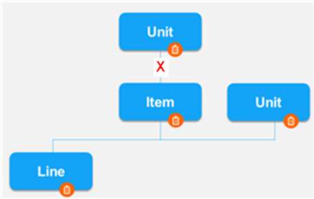 In this example the reference from Item to Unit is changed to "hidden". The Item does not inherit the messages related to Unit (on the top), the Line will not inherit it either. The Line will still inherit the Unit that is on the right side of the diagram.