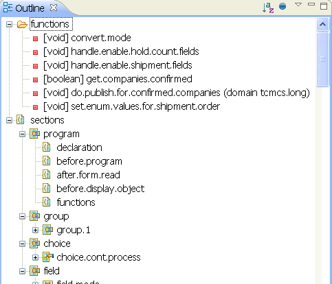 - For a UI script, the outline consists of functions (if any) and script sections, such as: