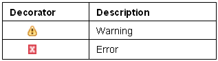 The following decorators are used to indicate errors and warnings. The decorators are displayed in the bottom left corner of the images of the involved nodes.