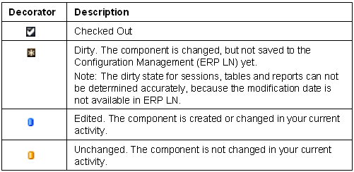 The following decorators are used to show Configuration Management related status information, which is mutually exclusive. The decorators are displayed in the bottom right corner of the software component image.