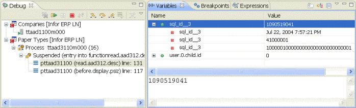 The left part of the screenshot shows the Debug view with the selected stack frame. The right part shows the Variables view with the stack frame's variables. In the screenshot, the Variables view consists of an overview pane (top) and a details pane (bottom).