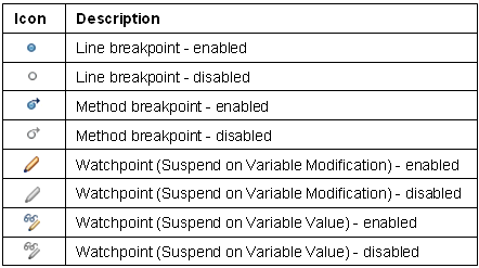 These icons are displayed in the Breakpoints view: