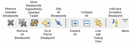 The toolbar of the Breakpoints view contains these buttons: