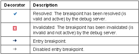 The following decorators are used to indicate whether a breakpoint is installed or invalidated. They are displayed in the bottom left corner of the breakpoint icon.