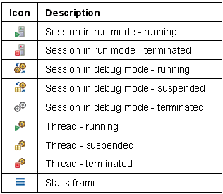 | Resume | Resumes a suspended session. The session resumes its execution and stack frames are no longer displayed for the session. The Variables view is cleared. |