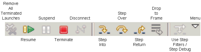 | Remove All Terminated Launches | Removes all terminated sessions from the Debug view. |