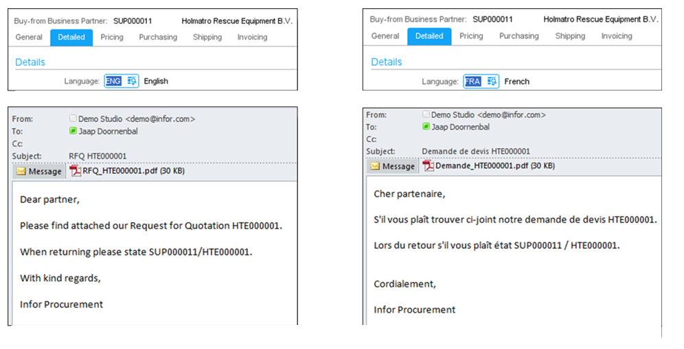 For each document type part, you can define language-dependent variants. This allows you to tailor the email subject and body to the customer’s language. For example, customers in France receive their documents and emails in French, while customers in the USA receive theirs in English.