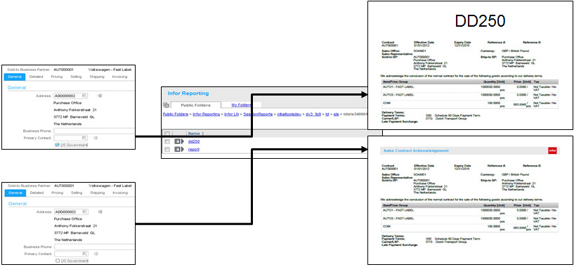 report. The specific report design is saved asdd250. Add a customer defined field (CDF) to the Business Partner (tccom110) table that indicates the business partner is the US Government. - You add the two different report designs to the report rule. The specific report design is used to render the report depending on the outcome of the expression.