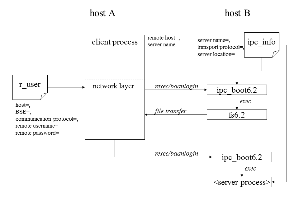The network layer opens the user’s remote user file $BSE/lib/user/r<user> and retrieves from that file the required information to start ipc_boot remotely. By default, you can start the remote ipc_boot by means of rexec. However, you can use baanlogin instead.