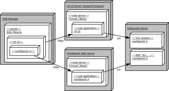The Workbench user interface, shown in the end user's browser, is supported by a web application. The web application communicates with the relevant BDE and DLL components in Enterprise Server.