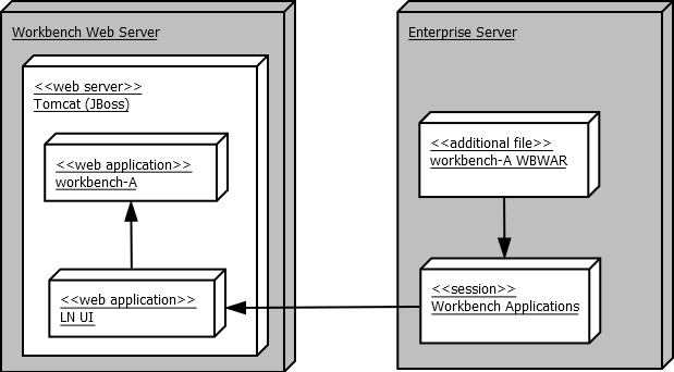 To activate the workbench as a web application, an administrator must deploy it from an additional file. The additional file must be present on the Enterprise Server, for example through distribution using the standard PMC tools. The administrator starts the deployment using the Workbench Applications session; this step requires that LN UI is operational on the workbench web server.