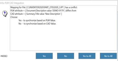 In Autodesk Inventor, if you are working with a part file and you enter a value for an "attribute" that is mapped to both, the following dialog box appears when you save the part file to PLM.