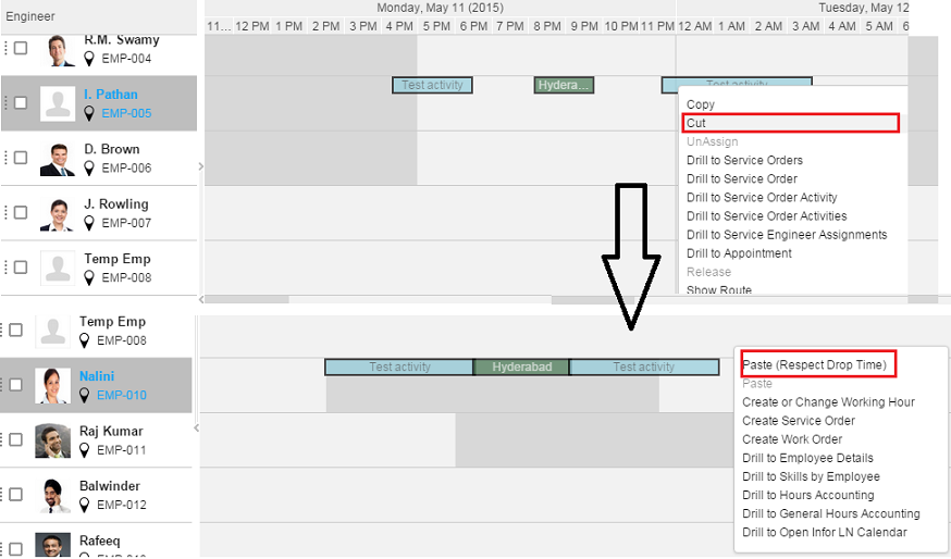 To use this functionality, you must select the Respect Drop Time option, select the multiple unassigned activities and link the activities to an Engineer on the Gantt chart, using the drag-and drop option. Activities are adjusted based on the Planning Method specified in the User Settings.