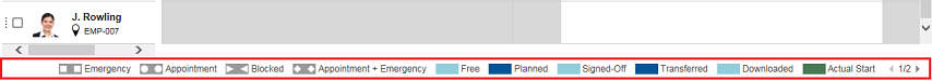 Seleccione la casilla de verificación Mostrar leyendas para enumerar las leyendas en el gráfico de Gantt. Nota: Si se selecciona el procedimiento de color de Tipo de servicio, las leyendas de Tipo de servicio también se muestran en el gráfico de Gantt. |