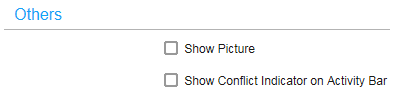 La casilla de verificación Mostrar imagen se usa para determinar si se debe mostrar la imagen del ingeniero. La casilla de verificación Mostrar el indicador de conflicto en la barra de actividades se usa para determinar si el indicador de conflicto se debe mostrar en todas las actividades en caso de que exista un conflicto. |