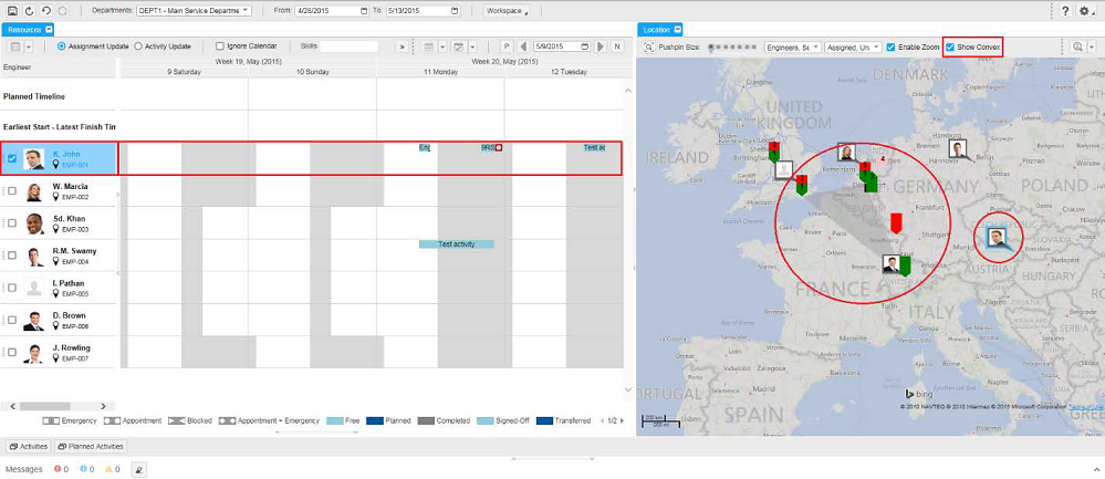 Se ha incluido en el mapa la nueva función Envolvente convexa para ver la zona geográfica en la que se distribuyen las actividades para un ingeniero. Para usar esta función, seleccione un ingeniero del mapa o del gráfico de Gantt y marque la casilla de verificación Mostrar Convex de la barra de herramientas del mapa. Se muestra la envolvente convexa para el ingeniero seleccionado con las asignaciones en el rango de tiempo del Gráfico de Gantt. A medida que cambia el rango de tiempo, la envolvente convexa se vuelve a dibujar teniendo en cuenta las asignaciones disponibles para el nuevo rango de tiempo.