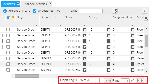 - Ahora, la planificación basada en el empleado también muestra las órdenes de trabajo junto con las asignaciones de orden de servicio. Todas las características de la consola, como asignar, desasignar, definir colores, realizar la planificación de múltiples actividades u operaciones de drillback, se pueden llevar a cabo en las órdenes de trabajo. La planificación de múltiples actividades también se puede realizar seleccionando las órdenes de servicio y las órdenes de trabajo.