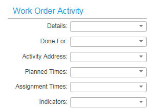 - Todas las opciones de filtro se agrupan en un cuadro de lista desplegable. Las opciones de filtro son Mostrar todo, Contexto de actividad seleccionado, Contexto de orden seleccionado, Vista de tipo de hora de trabajo, Mostrar todas las actividades solapadas y Mostrar todas las actividades interrumpidas.