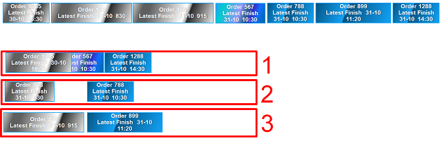 In de bovenstaande afbeelding zijn nu dankzij de afvlakking van de werklast andere jobs toegewezen aan groep 1 en 2. Stel nu dat een medewerker zich 's morgens ziek meldt. De capaciteit moet dan worden verminderd van 3 parallelle groepen naar 2. De firm-planned activiteit van groep 3 wordt handmatig verplaatst naar groep 2.