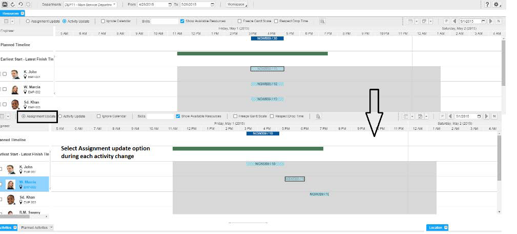 De sectie Toegewezen activiteiten toont een grafische weergave van de serviceactiviteiten, op basis van de geplande start- en eindtijd van de opdracht. De gebruiker kan alle medewerkers in het linkerdeelvenster bekijken en alle orderactiviteiten die zijn toegewezen aan de medewerkers in het rechterdeelvenster. De beschikbaarheid van de medewerker wordt op basis van de kalendergegevens ook weergegeven. De eerste en tweede rij van de Gantt-grafiek tonen de activiteitenbeperkingen van een geselecteerde activiteit, inclusief de geplande start-/eindtijd, de vroegste starttijd/laatste eindtijd, de kalender die aan de installatiegroep is toegewezen, enzovoort.