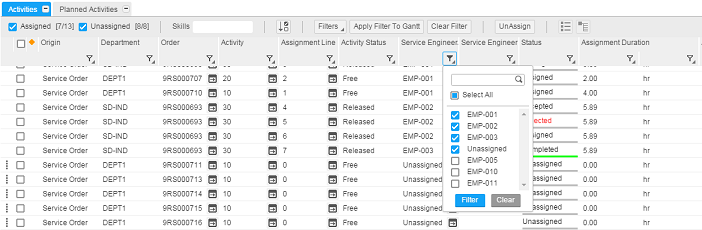 In het activiteitenraster worden de toegewezen of niet-toegewezen activiteiten weergegeven voor de tijdshorizon die u in de werkbalk hebt opgegeven. Gebruik de filters die beschikbaar zijn voor elke kolom om gegevens te filteren en een beperkte reeks of selectie weer te geven.