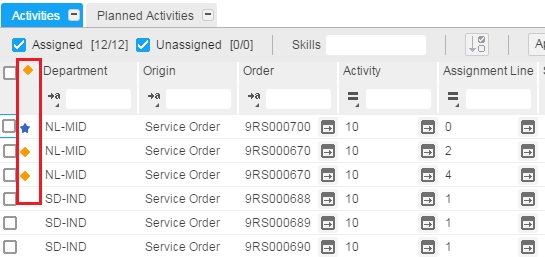 De niet-toegewezen en toegewezen activiteiten worden weergegeven in de rasterweergave. De gebruiker kan serviceactiviteiten met status Vrij/Beschikbaar, Gepland en Vrijgegeven inzien.