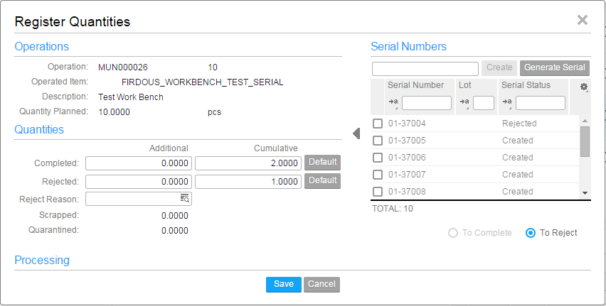 - 用户还可以从列表中选择特定序列号。选择一个或多个序列号后,用户必须单击“待完成数量”或“待拒收数量”选项以指示要为序列化物料执行的动作。将填充相关数量。仅显示状态设置为“已创建”、“已分配”或“已拒收”的序列号。
