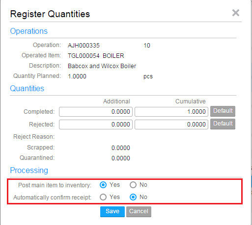 - 如果设置为“是”:当报告最后一道工序数量完成并且允许将主物料过账至库存时,在“数量登记”窗格或“完成工序”窗格中显示以下字段: