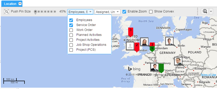 可以使用两个列表中提供的选项来筛选要显示的数据。图中显示的是在员工和服务订单上应用的筛选。同样,您可以对必须在地图上显示的已分派活动、未分派活动和员工的位置进行筛选。
