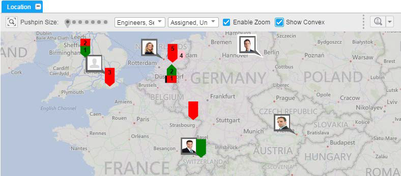 此部分提供工程师和活动(已分派/未分派/已计划)的地图视图,可帮助轻松确定工程师和活动的位置。