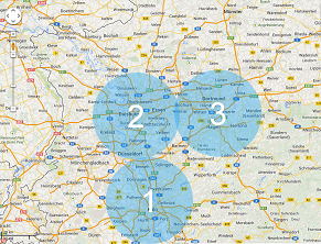 LN calcola il gruppo dinamicamente. Quest'ultimo dipende dall'ubicazione (geografica) del carico di lavoro, il quale determina anche la composizione del gruppo. Il motore di pianificazione che calcola il gruppo è già in uso per la pianificazione aree ed è disponibile per la pianificazione di gruppo. Nell'immagine a sinistra è rappresentato il carico di lavoro per la giornata di mercoledì, mentre in quella di destra quello per la giornata di giovedì. Il motore calcola i vari gruppi geografici.