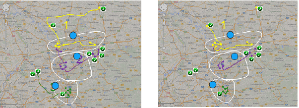 Isso leva à situação indicada pelas linhas brancas na imagem à esquerda (com as rotas originais para referência). Depois de implementar o cálculo de rota, nos agrupamentos recém-calculados, o planejamento de rota conecta as atividades com planejamento firme. Isso é mostrado na figura à direita.