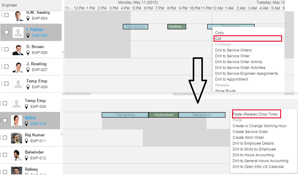 要将所选活动重新分派至其他员工并使用多活动计划,必须为所需时间选择“遵循拖放时间”选项并将所选活动链接至(使用拖放选项)其他员工。基于“用户设置”,会使用多活动计划功能。