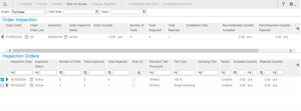 LN verwendet die festgelegten Prüfdaten und den Status der Prüfauftragsposition als Voreinstellung für die entsprechende Prüfauftragsposition im Programm Prüfauftrag (qmptc1100m100).