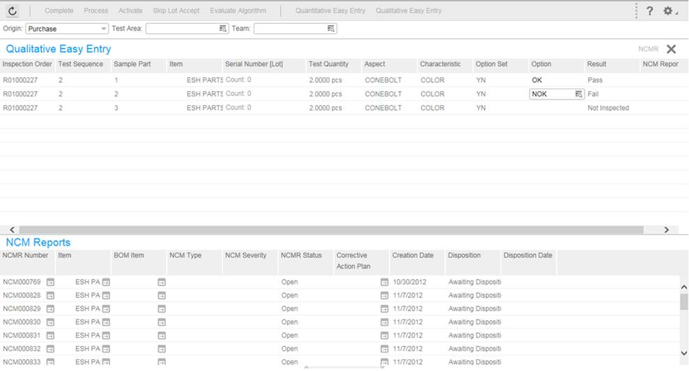 klicken, wenn die Daten in allen Positionen festgelegt wurden, um einen Bericht für fehlerhaftes Material (NCMR) für die ausgewählte Prüfdatenposition mit dem Ergebnis "Nicht bestanden" zu generieren. - Die Berichte über Fehlerhaftigkeiten im Fenster "Berichte über fehlerhaftes Material" für die festgelegte Kombination aus Artikel und Handelspartner anzeigen. Außerdem können Sie in diesem Fenster auf die Programme "Bericht über Fehlerhaftigkeit (qmncm1100m000)", "Maßnahmenplan (CAP) (qmcpl1100m000)", "Artikeldaten (tcibd0101s000) und "Stücklistenartikel" zugreifen. Hinweis: Der Status der Berichte über Fehlerhaftigkeit darf nicht auf "Storniert" oder "Abgeschlossen" gesetzt werden.