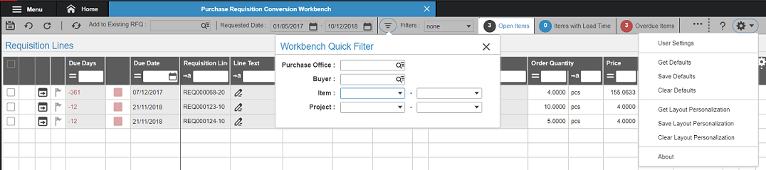 • 要求日付:このフィールドは、購買要求を要求する日付に基づいてデータをフィルタ処理するために使用します。要求フィルタに基づいて、要求ラインが表示されます。