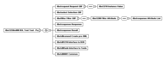 This (dummy) XML schema provides insight into the technical structure of the BOL Test Tool - Public Layer (tlbct3250m000) session. Each element represents a program script/ DLL. The links between scripts must be interpreted as: script X uses script Y (read from left to right). For example: script tlbct3250 uses tlbctrequest.