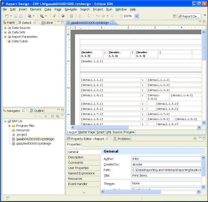 To open the report design, go to the Navigator and double-click the report design. Alternatively, select the report design and, on the shortcut menu, click Open. The report layout is displayed in the editor area and report data is displayed in the Property Editor. This diagram shows an example: