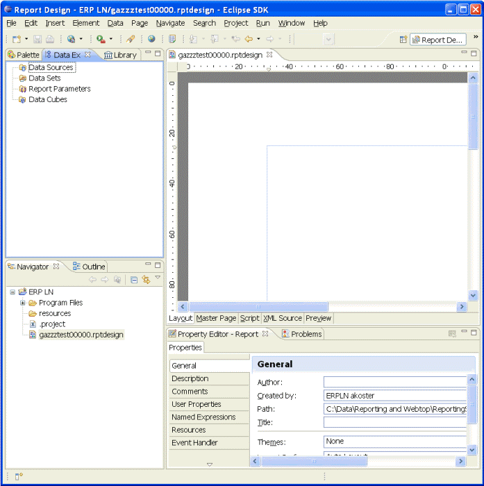 To open the report design, go to the Navigator and double-click the report design. Alternatively, select the report design and, on the shortcut menu, click Open. An empty report layout is displayed in the editor area and report data is displayed in the Property Editor. See the following figure for an example.